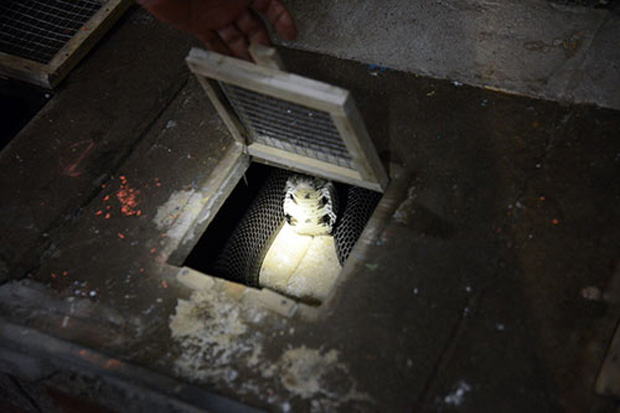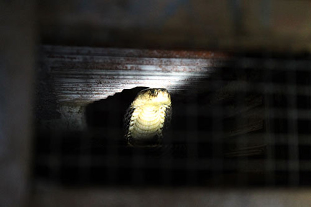 Khi cánh cửa lồng rắn bật mở, dõi ánh mắt theo tia sáng leo lắt từ chiếc đèn pin hắt vào phía trong lồng, bất chợt một chiếc đầu rắn hiện lên trong bóng tối. Con rắn lúc này đã phình mang to gấp 3 lần bình thường, cặp mắt đen sì nhưng sắc lạnh như muốn nuốt chửng con mồi.