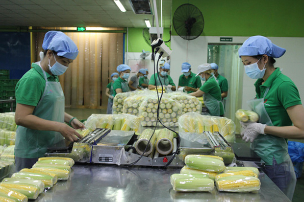 Ngoài sân trung tâm, xe tải xếp hàng dài. Bên trong, không khí náo nhiệt như một khu chợ truyền thống. Dưa leo, cải ngọt, cải xanh, rau muống, mồng tơi, ớt, bắp, đậu que, đậu đũa... để kín cả lối đi. Người đẩy xe, người kiểm hàng, người lấy mẫu... tất bật luôn tay. Các nhân viên tổ đóng gói tay thoăn thoắt đóng gói, dán nhãn và chuyển hàng. Họ làm việc miệt mài đến 24 giờ mới được nghỉ giải lao và ăn cơm.