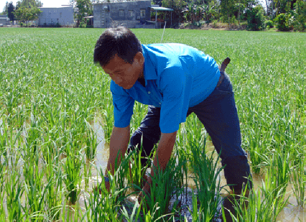 Ông Nguyễn Anh Dũng kiểm tra quá trình phát triển của cây lúa. Ảnh: C.T