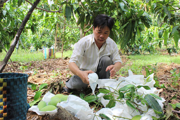 Trước đây, vì ham trái, anh sử dụng nhiều phân hóa học, thuốc bảo vệ thực vật… Những gốc xoài sai trĩu quả nhưng thường xuyên bị sâu bệnh, trái "móp đầu, méo đuôi", nên loại 1 không nhiều. Thu nhập cũng vì thế mà bấp bênh, lúc được, lúc mất. Hai năm trở lại đây, anh chuyển sang giảm tỷ lệ phân, thuốc... thay vào đó tích cực chăm sóc vườn xoài theo hướng VietGAP để phát triển bền vững. Hiện tại, với sản lượng bình quân khoảng 10 tấn/ha/năm, anh thu về 300 triệu đồng mỗi năm, tăng gấp đôi so với thời anh chưa áp dụng VietGAP. Trừ chi phí sản xuất, gia đình anh thu lãi hơn 200 triệu đồng.